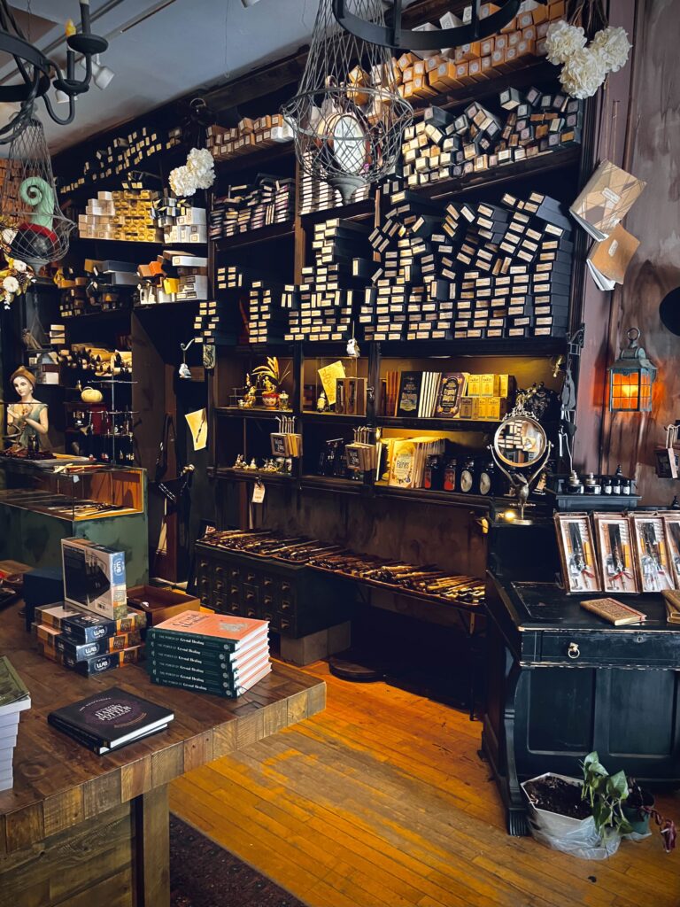 Step inside Wynott’s Wands, and you immediately understand why visitors describe it as “feeling like you walked into Ollivander’s.” Wands line the walls from floor to ceiling. Knowledgeable staff members help guests find the perfect wand. There’s even a goblin figure watching from an upper level, adding to the immersive atmosphere.