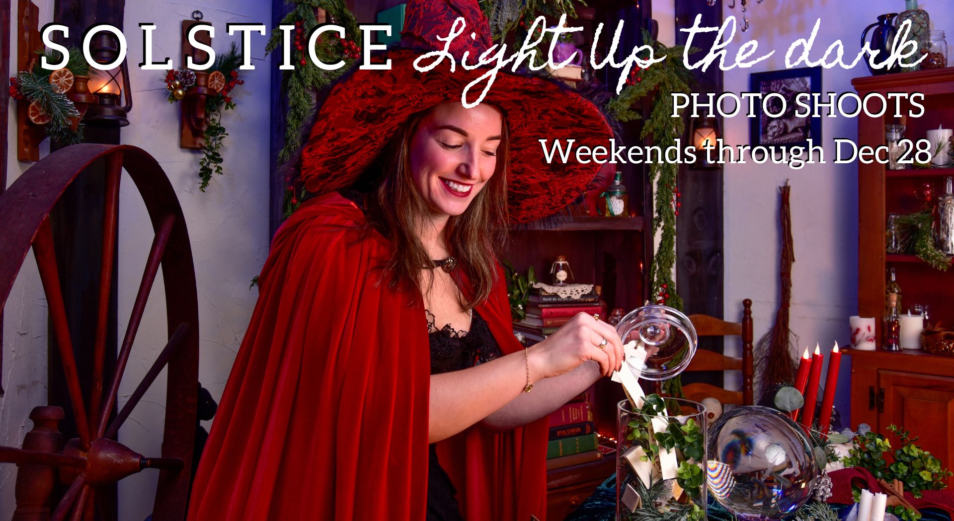 ILLUMINATE THE DARKNESS WITH A SOLSTICE PORTRAIT SESSION, ON OUR OLDE SALEM VILLAGE AND WITCH COTTAGE SETS DECORATED WITH LUSH EVERGREEN.