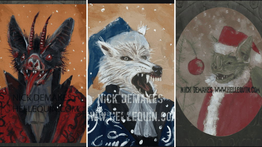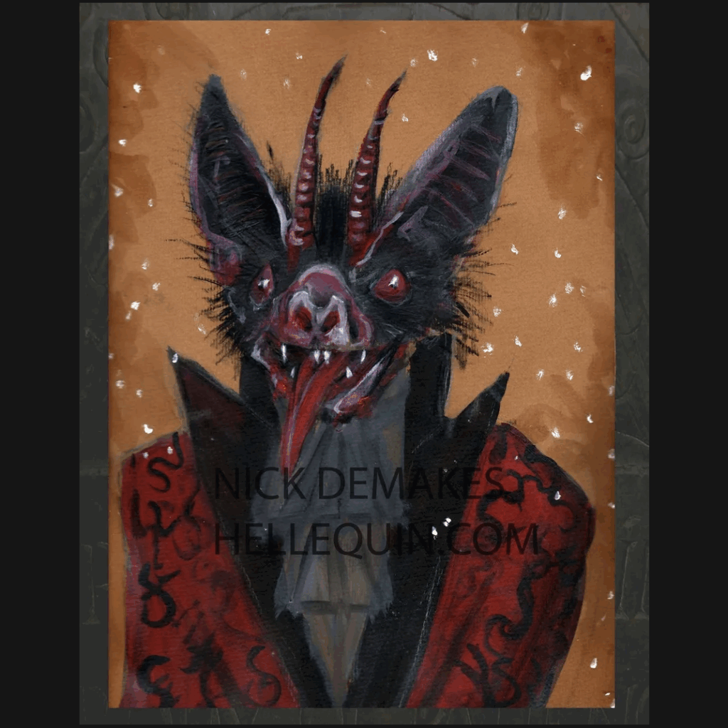 Beyond Gentlemen Bats, Nick creates other fantasy and horror-themed art, including “Hellequin,” which is based on the folklore of the Demon Huntsman. His artistic philosophy embraces unconventional materials—he’s experimented with radiator patches and fruit juices alongside traditional mediums.